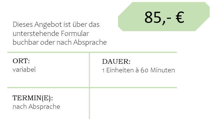 Die Einzelstunden finden – je nach Thema – an unterschiedlichen Orten statt, damit das Training realitätsnah und alltagstauglich bleibt. Wie viele Stunden sinnvoll sind, hängt von euren Themen, Zielen und zeitlichen Möglichkeiten ab. Wichtig ist mir Hilfe zur Selbsthilfe: nachhaltige Veränderung entsteht vor allem durch die Umsetzung im Alltag. Zwischen den Trainingseinheiten stehe ich dir für Rückfragen telefonisch, per E-Mail oder WhatsApp zur Verfügung.